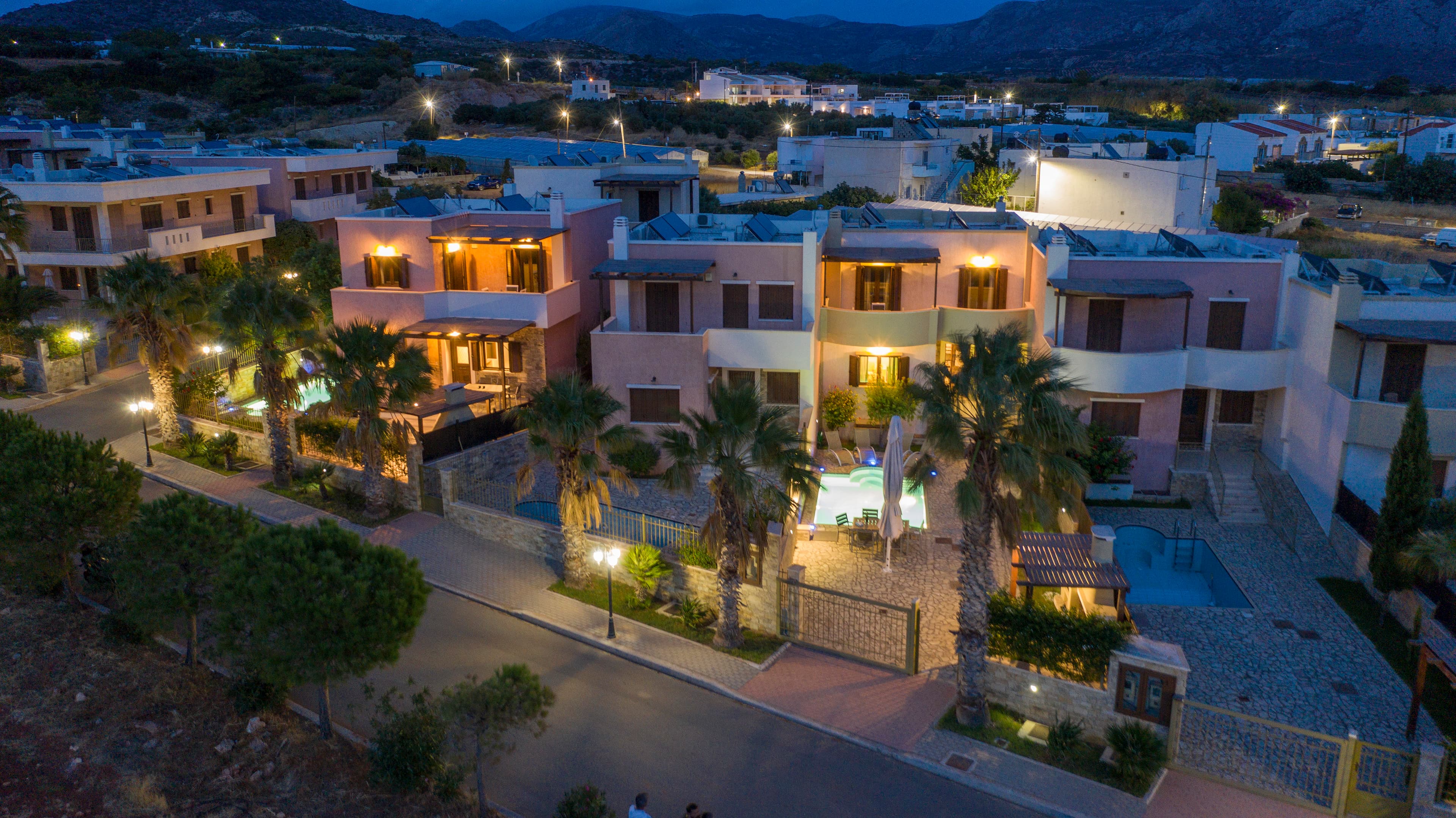 Un des meilleurs rapports qualité/prix du Lassithi. Villas livrées meublées avec piscine privée, dans un complexe sécurisé à 5 min de la plage. Le potentiel locatif est fort : 4 chambres permettent d'accueillir des familles ou groupes prêts à payer 250-350 €/nuit en haute saison. La zone de Makry Gialos est en pleine expansion touristique avec encore peu de concurrence premium.