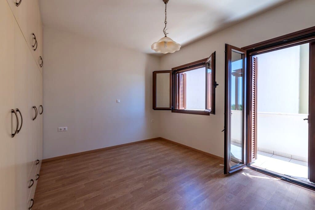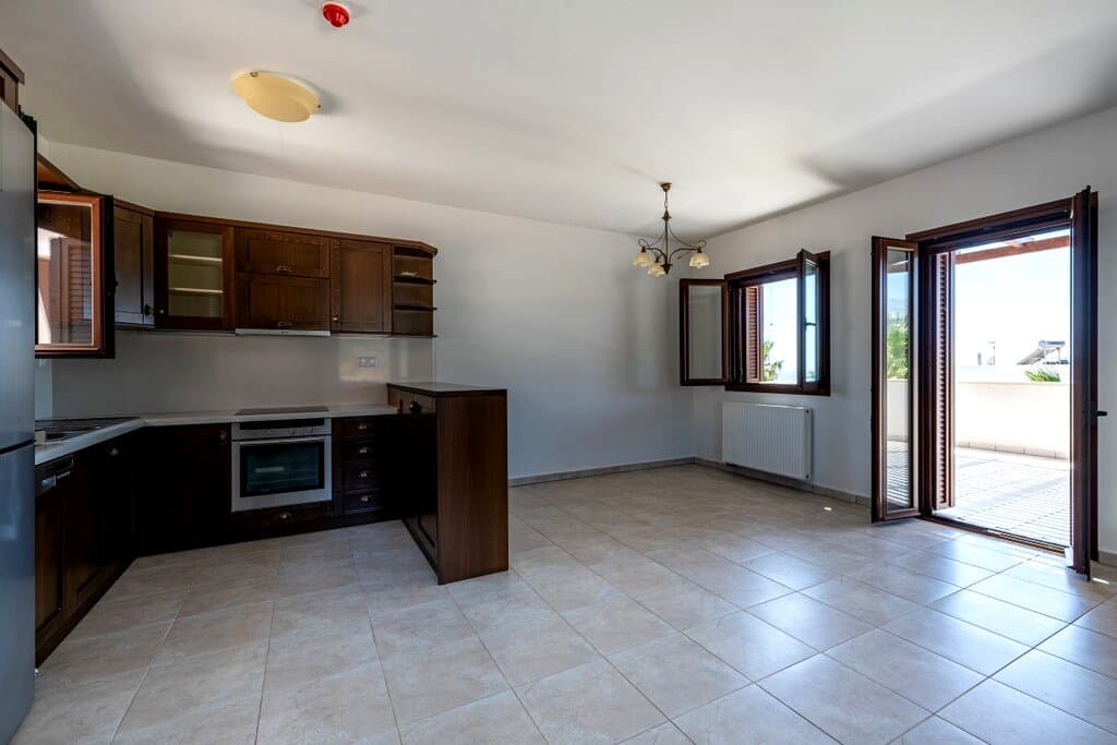 Appartement de 146 m2 au premier etage a Makrigialos, a 300 metres de la mer. Deux chambres, un sejour spacieux, une salle de bain et une pergola en bois avec vue sur les montagnes du Lasithi. L'orientation plein sud assure un ensoleillement optimal. Le bien est fonctionnel, propre, habitable en l'etat. Depuis la pergola, la vue porte sur les montagnes du Lasithi, un panorama different des appartements tournes vers la mer. L'orientation plein sud garantit du soleil toute l'annee, y compris en basse saison quand les randonneurs et les couples cherchent le calme. A 1 815 EUR/m2, c'est le point d'entree le plus accessible pour du Makrigialos habitable, avec un ecart de prix de plus de 35% par rapport a l'ouest de la Crete.